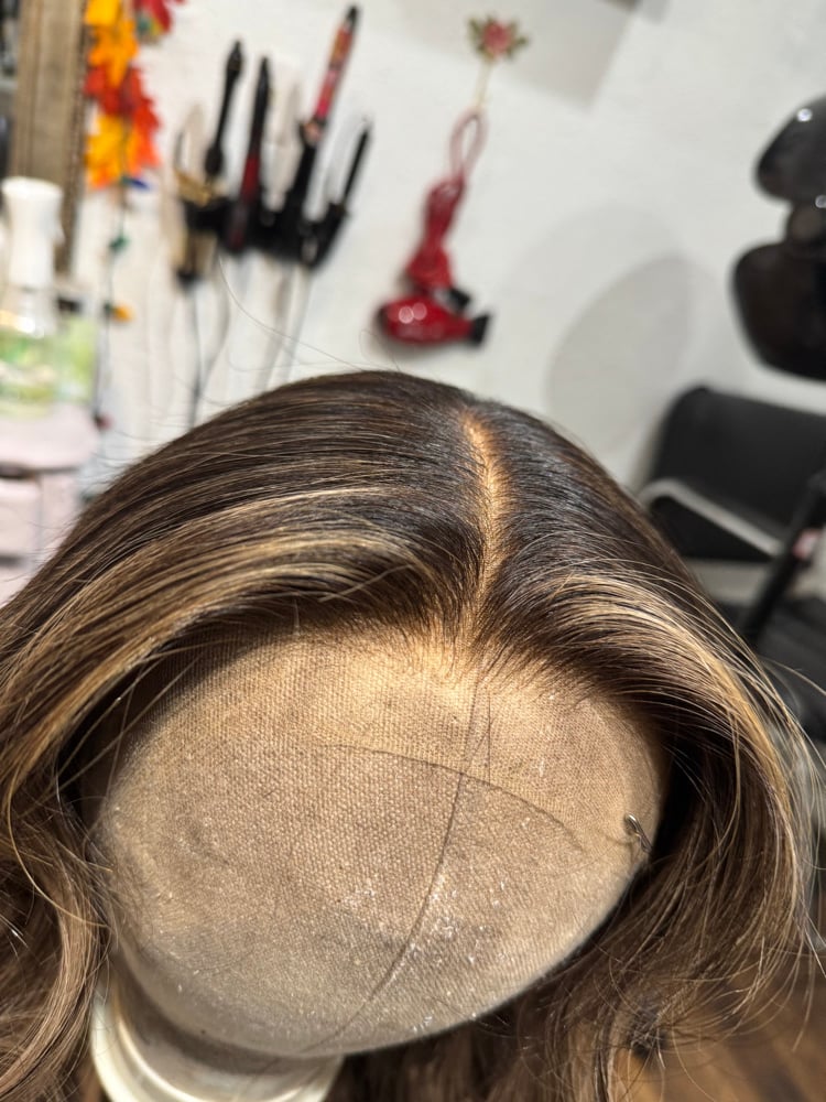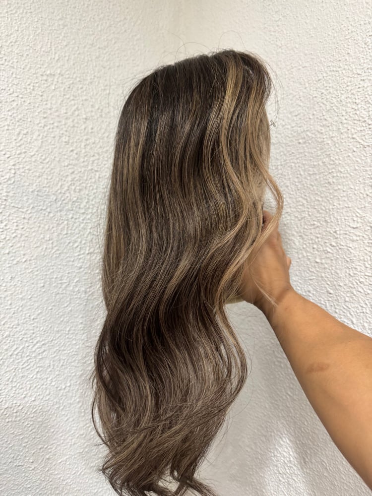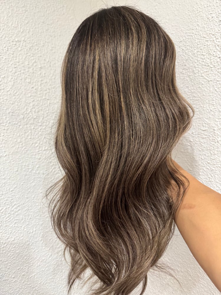 Neutral darkest brown (Level 3) blended with beige blonde balayage + babylights that flow softly through the crown and parting area.