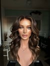wig color: level 5 neutral brown base with light caramel subtle balayage highlights